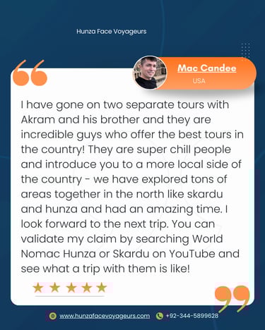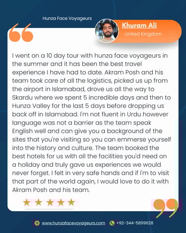 They were the only ones who responded quickly and professionally to all my questions—from itinerary and food to what to wear and safety tips. Being a team of locals from northern Pakistan, they know the region inside out, and I felt completely safe, welcomed, and comfortable throughout the trip.