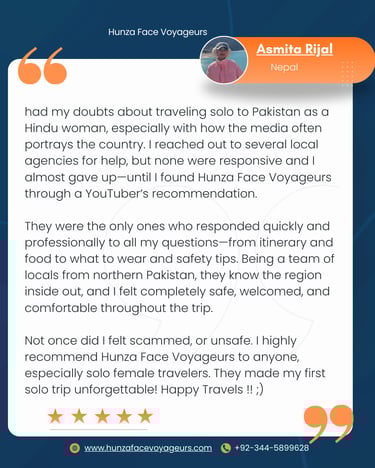 had my doubts about traveling solo to Pakistan as a Hindu woman, especially with how the media often portrays the country. I reached out to several local agencies for help, but none were responsive and I almost gave up—until I found Hunza Face Voyageurs through a YouTuber’s recommendation.